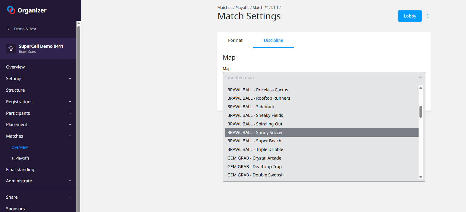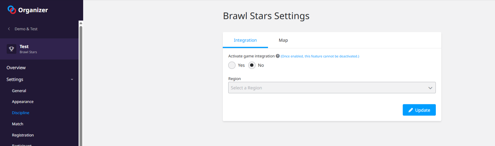 You can enable the Brawl Stars integration in your tournament, to automate match lobbies and results. To do so, head into your Brawl Stars tournament Settings > Discipline, and activate it while selecting the Region for your tournament: